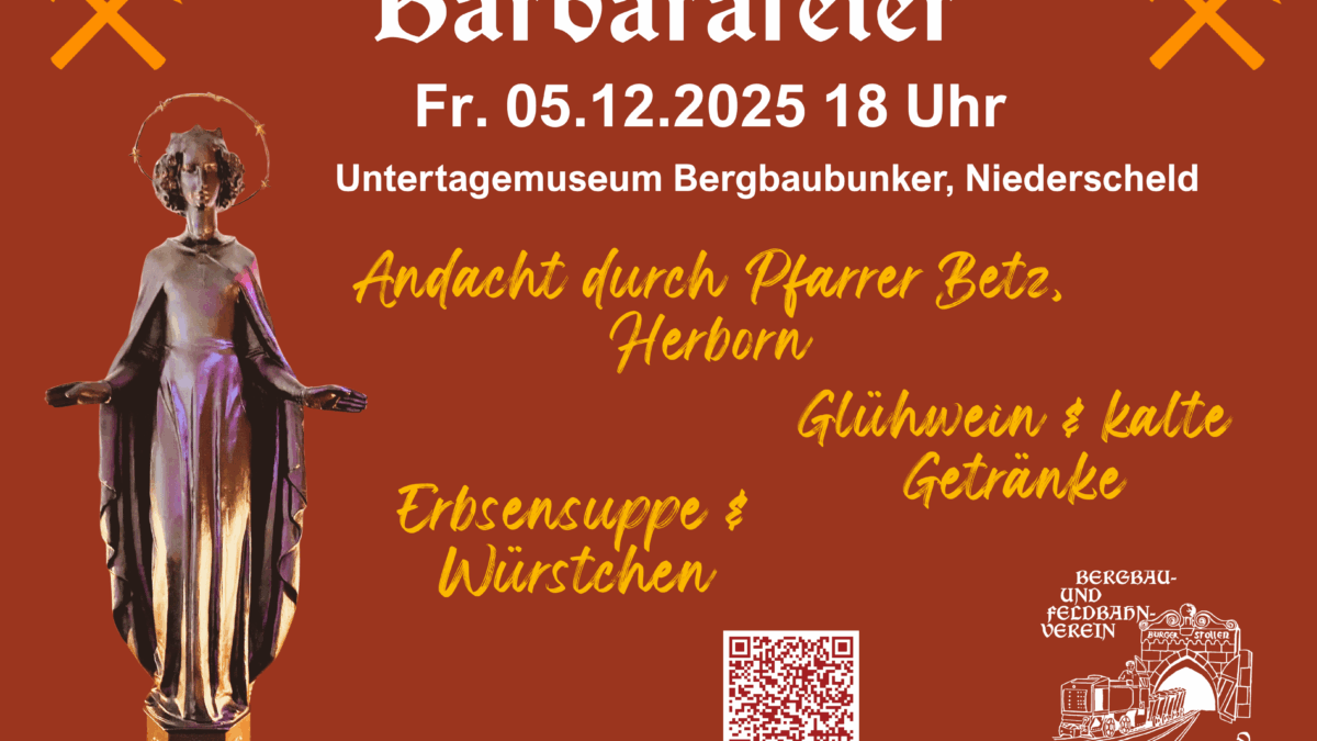Der Bergbau- und Feldbahnverein Schelderwald e. V. feiert am Freitag, 5. Dezember 2025, um 18 Uhr die Barbarafeier im Untertagemuseum „Bergbaubunker“ Niederscheld. Pfarrer Betz aus Herborn eröffnet die Feier mit einer Andacht zu Ehren der heiligen Barbara, der Schutzpatronin der Bergleute. Danach gibt es Erbsensuppe mit Würstchen, Glühwein und kalte Getränke. Besucher können die bergmännische Tradition unter Tage erleben und die Ausstellungsstücke im Museum besichtigen.
