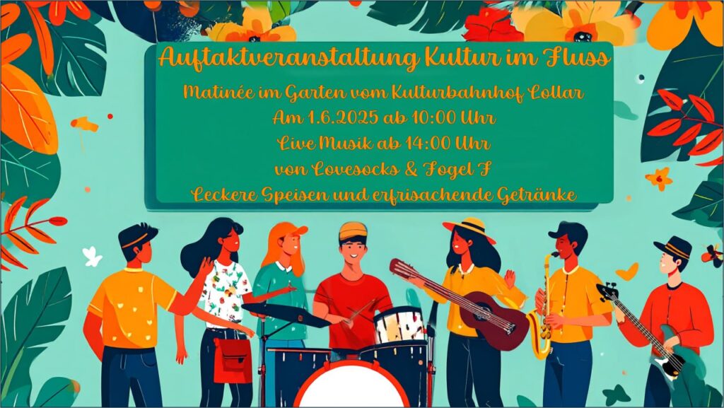 In google maps öffnenAm Sonntag, den 1. Juni, lädt der Kulturbahnhof zur Matinee im Garten ein. Ab 10 Uhr können sich Besucherinnen und Besucher bei einem gemütlichen Start auf kulinarische Köstlichkeiten und einen entspannten Austausch freuen. Ab 14 Uhr sorgen die Bands „Lovesocks“ und „FogelF“ für Live-Musik unter freiem Himmel.
